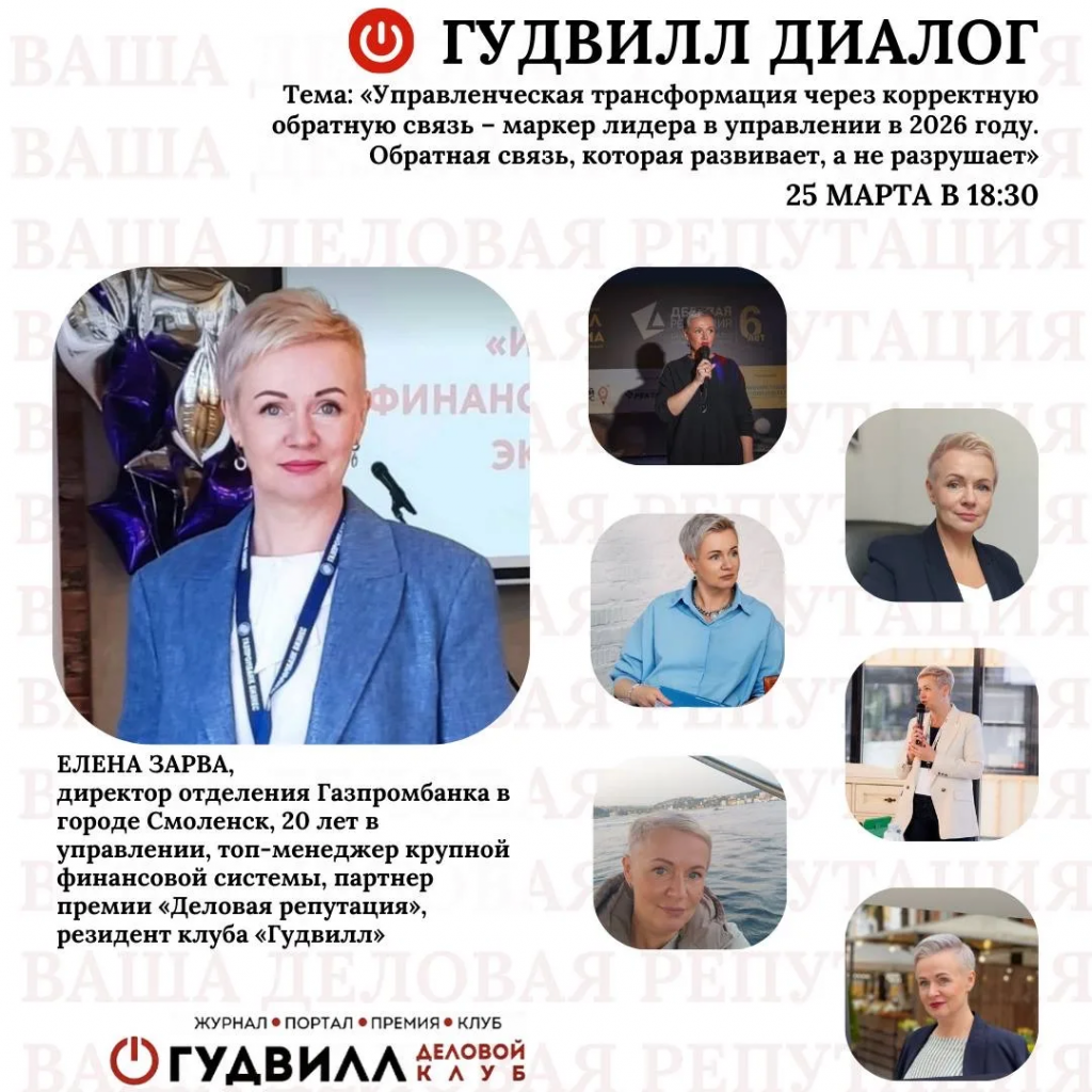 В рамках проекта “Гудвилл. Диалог” пройдет мероприятие «Управленческая трансформация через корректную обратную связь – маркер лидера в управлении в 2026 году. Обратная связь, которая развивает, а не разрушает». Его проведет Елена Зарва, Директор отделения Газпромбанка, управленец с двадцатилетним опытом.